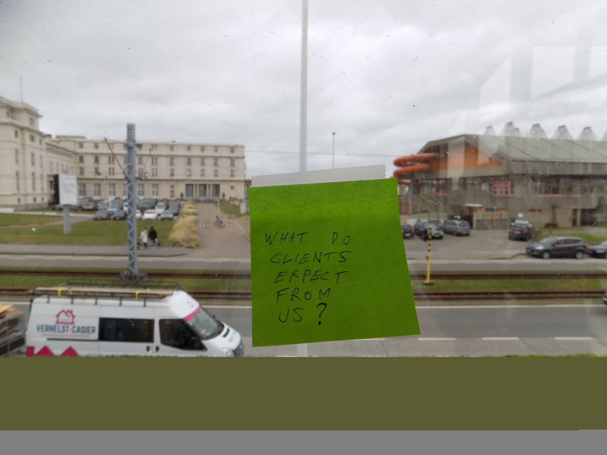 Today we met De Bono, a psychologist. We finished the design of our project; We know what we want to know, for who and why. With the help of Foton we set up some critical success factors. Now we need to test our proposition. De Bono inspires us to be our own evaluator and feedback giver. The idea is simple: you take 5 coloured hats. Each hat represents a perspective. Present your plan, product or service. The white hat notes questions about facts & figures. The black hat can be evil critical. The yellow hat is exclusively positive. The green hat listens creatively and widening. The red hat empathises and discusses feelings and perception. During the presentation you note the De Bono inspiration on post-its. They are the input for discussion and debate. Martine Meire, director of Leisure, is the external evaluator. She chooses the yellow hat.
