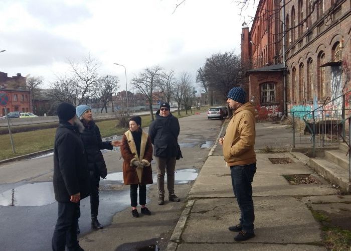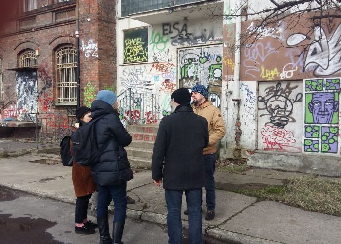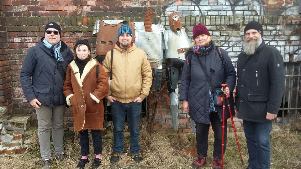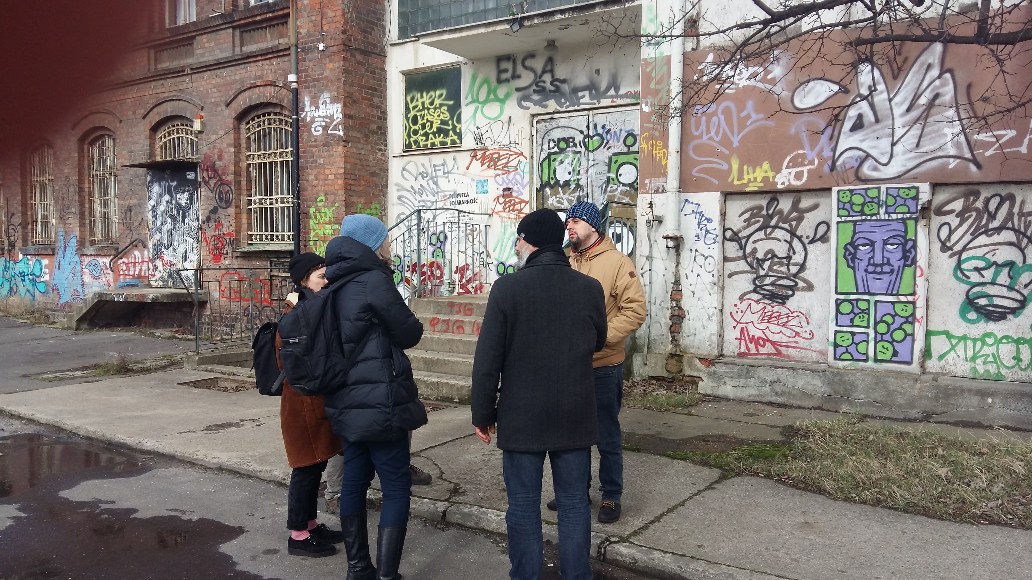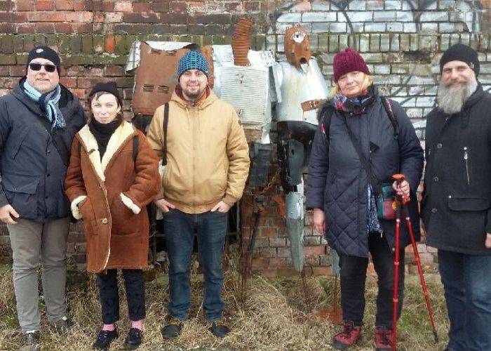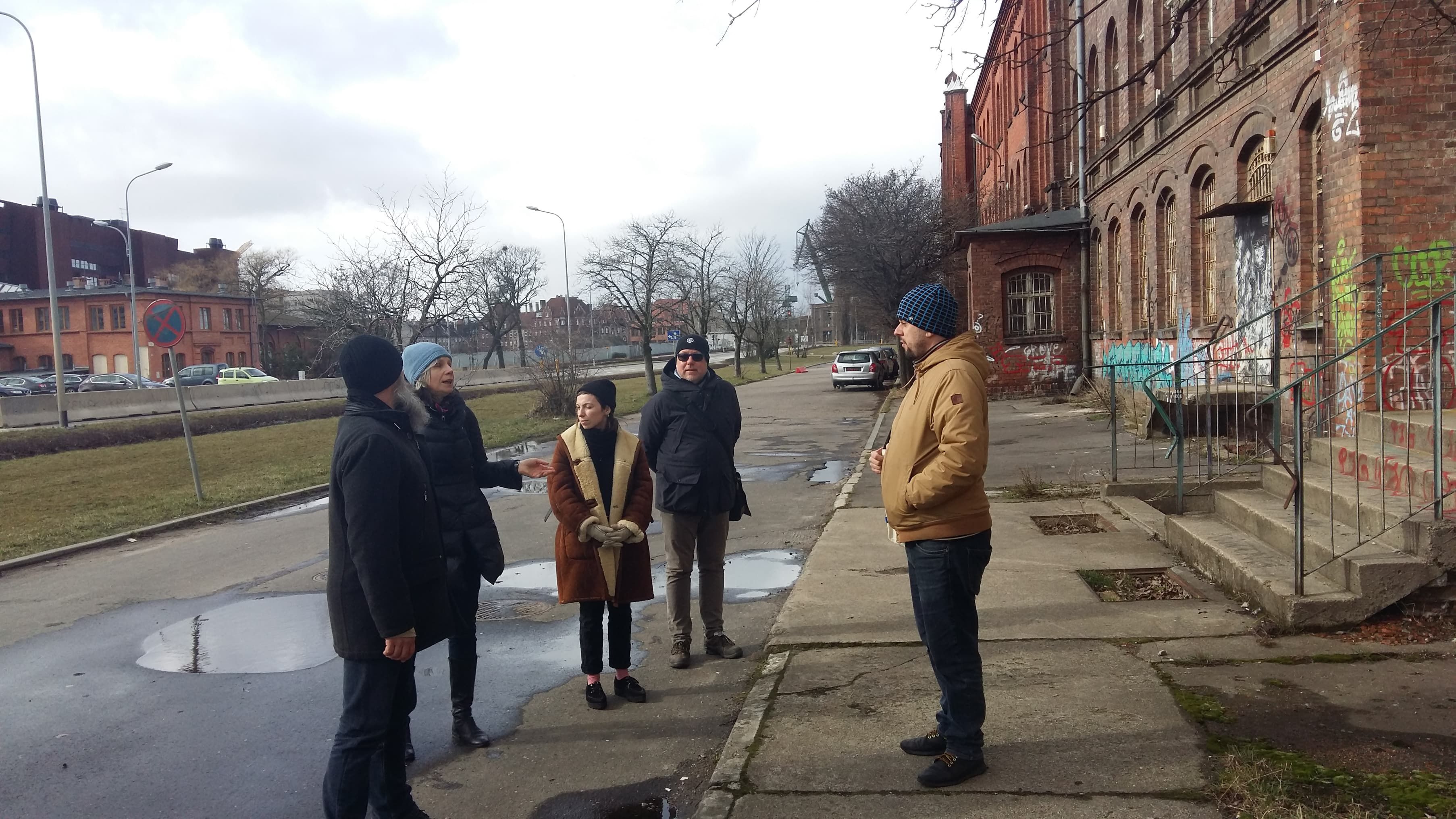 Visiting former Gdansk Shipyard grounds with Iwona Zajac along the route of her artistic practice there. She had shown us, among others, the building which used to accommodate “Colony of Artists”, a group of artists who created their works in the shipyard.